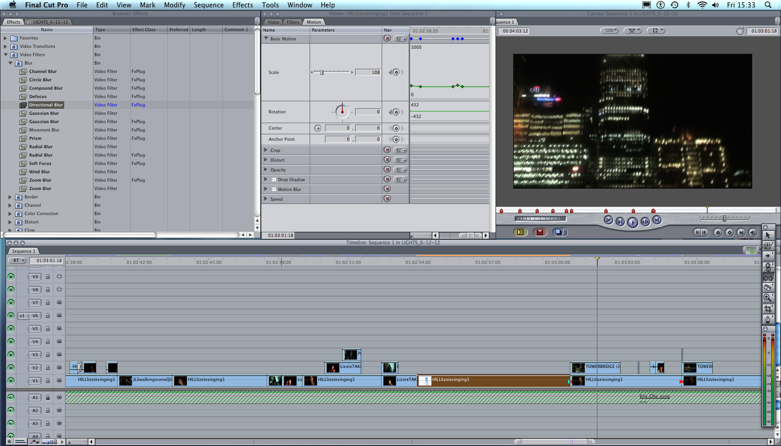 We linked our opening footage of the blurred lights for the ending, as we used the same shot for the beguinning and end, however, for the end shot we used the overlay of shots of our music artist with the same blurred light shot. We did use some effects/editing features to adjust the colour, brightness and contrast of both of the pieces of footage, as with most of the footage within our music video.